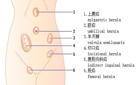疝气是人体内某个脏器或组织离开其正常解剖位置,通过先天或后天形成的薄弱点、缺损或孔隙进入另外一部位,常见的有脐疝、腹股沟疝、切口疝、股疝等。