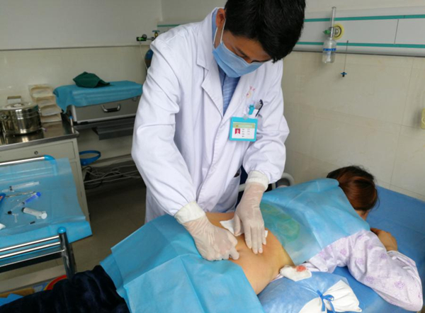 患者刘某,女,36岁。今年春节假期间出现右侧髋关节酸疼,去医院看病怀疑是骶骹关节炎,开药吃了一段时间不起作用,且逐渐出现右大腿、右小腿后侧也疼痛,早晨起床时尤甚,在博爱医院做了CT显示:腰4—5、腰5骶1椎间盘突出,腰4—5水平椎管狭窄,以右腿神经根受压为著。根据病人的情况,结合患者局部痛点,由骨科微创专家杜华给予拨针微创介入治疗。